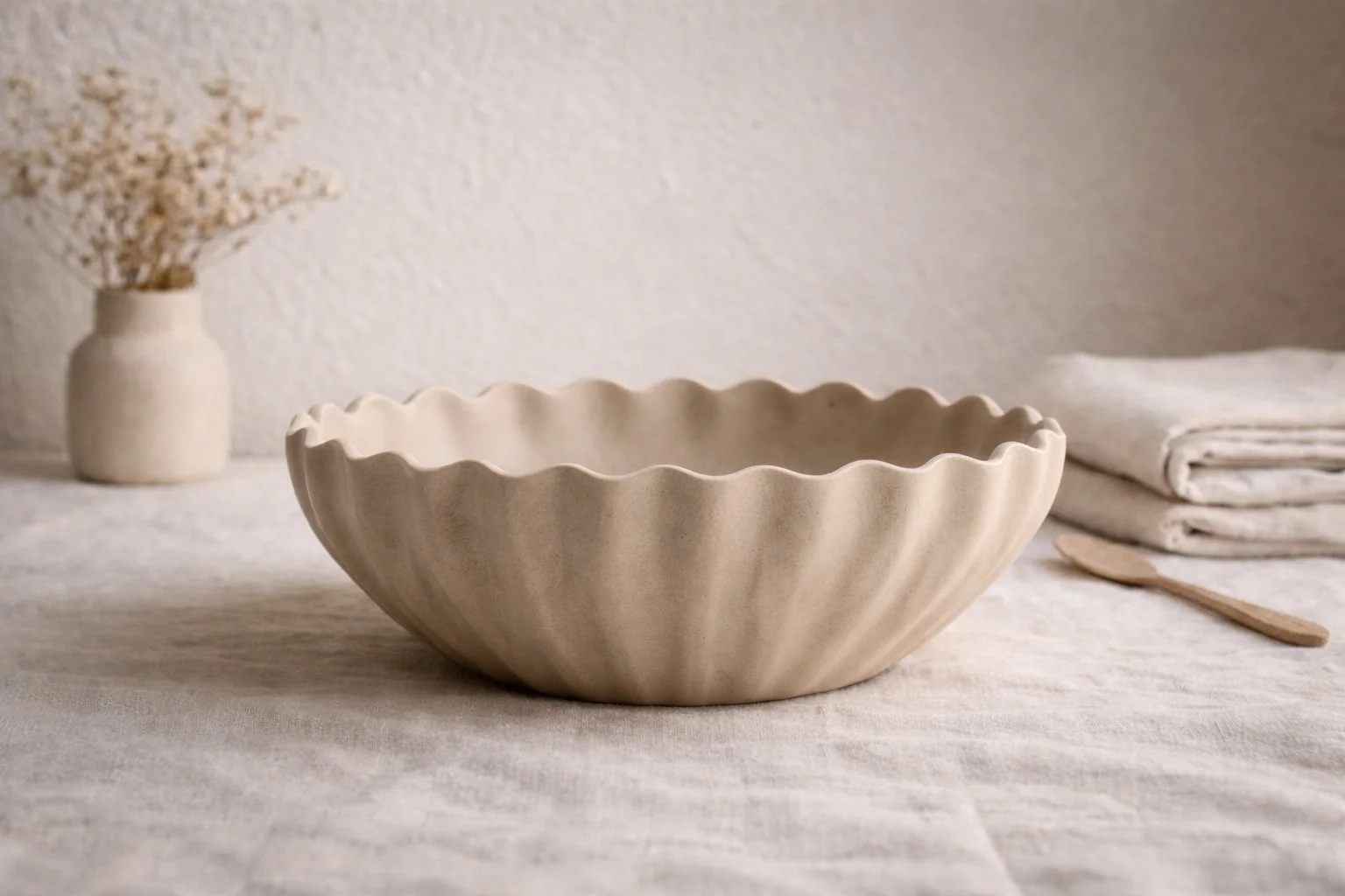 Its soft, wave-like walls fall naturally, like fabric, embracing the food rather than containing it.